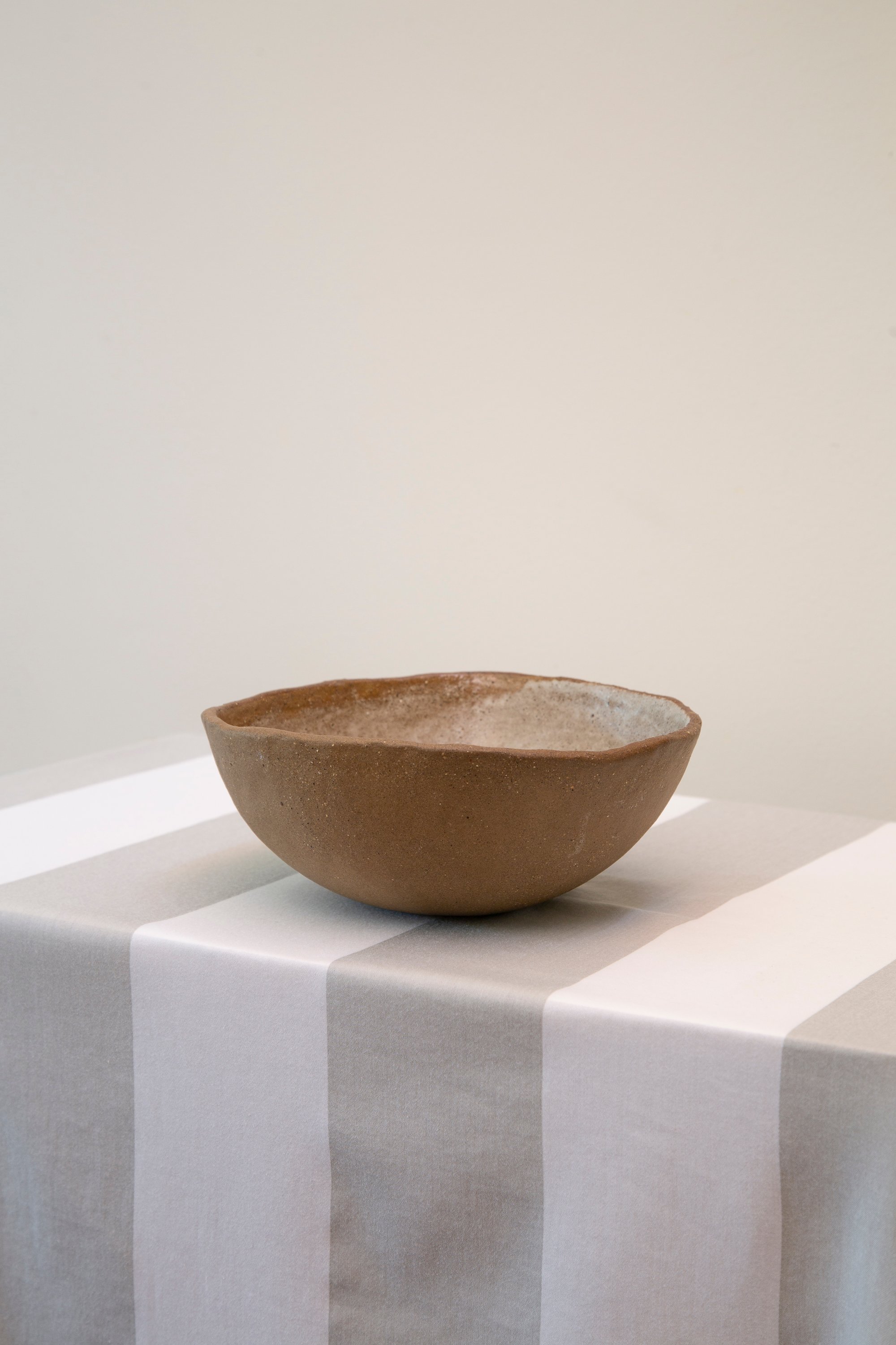 Handbuilt. Brown stoneware. Interior glazed white, exterior unglazed.